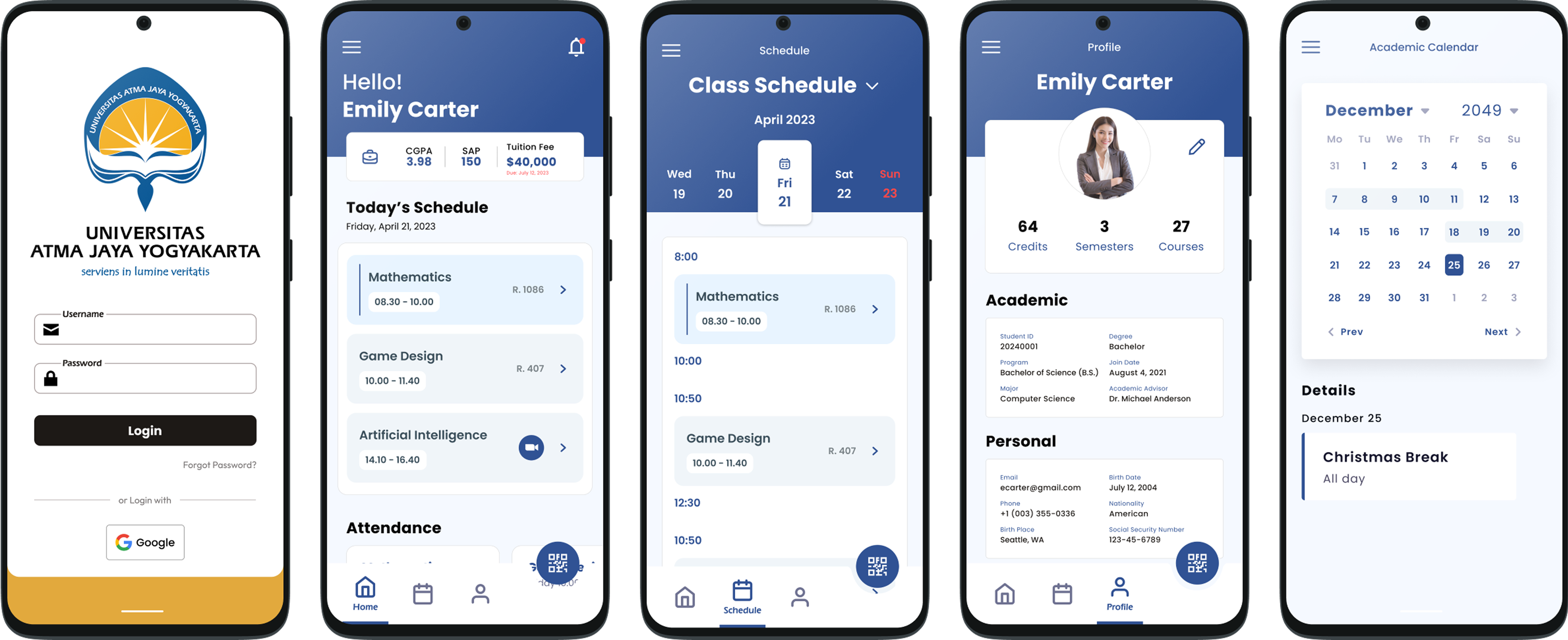 Atma Student is a redesign of Universitas Atma Jaya Yogyakarta’s student portal application. The goal of the redesign was to create a more modern and cohesive interface that enhances usability and accessibility for students. The new design focuses on simplifying how students manage their academic information, from viewing schedules and grades to accessing announcements and scholarship details—all within a clean, consistent interface.